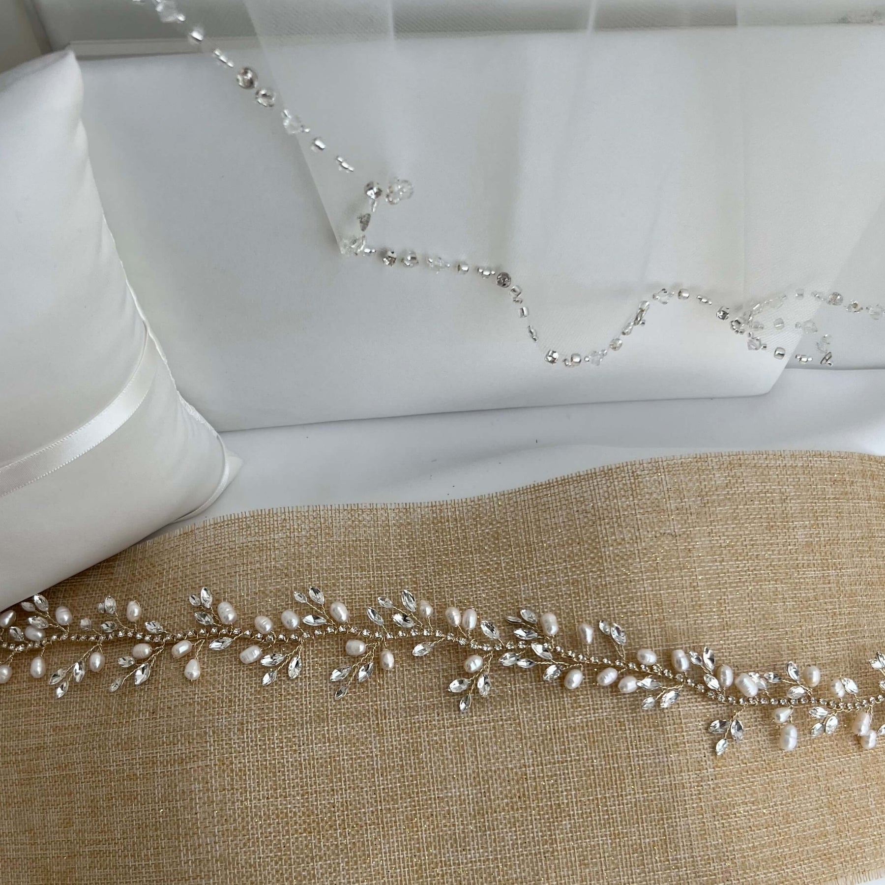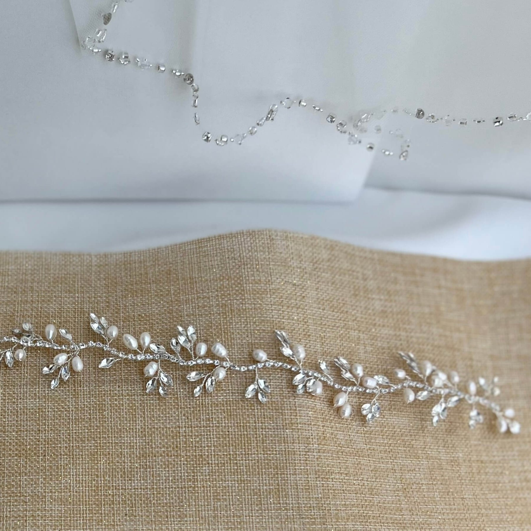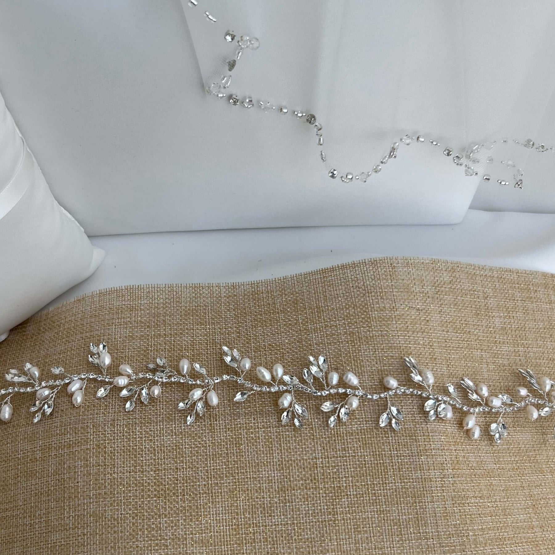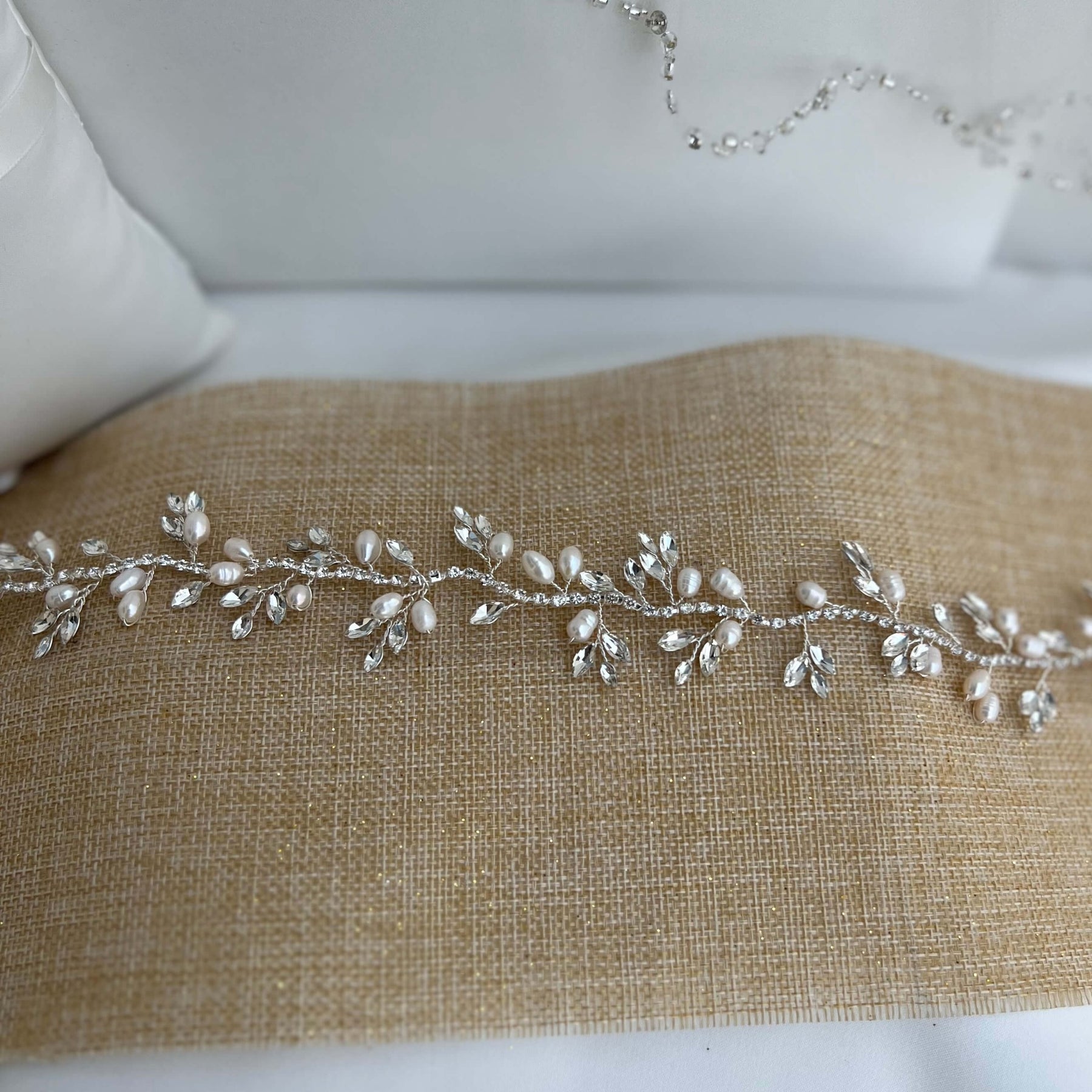 The silver bridal hair vine is designed with high quality rhinestones and white pearls.
