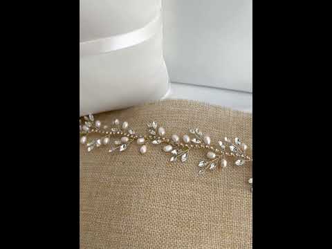 The gold bridal hair vine is designed with high quality rhinestones and ivory pearls.