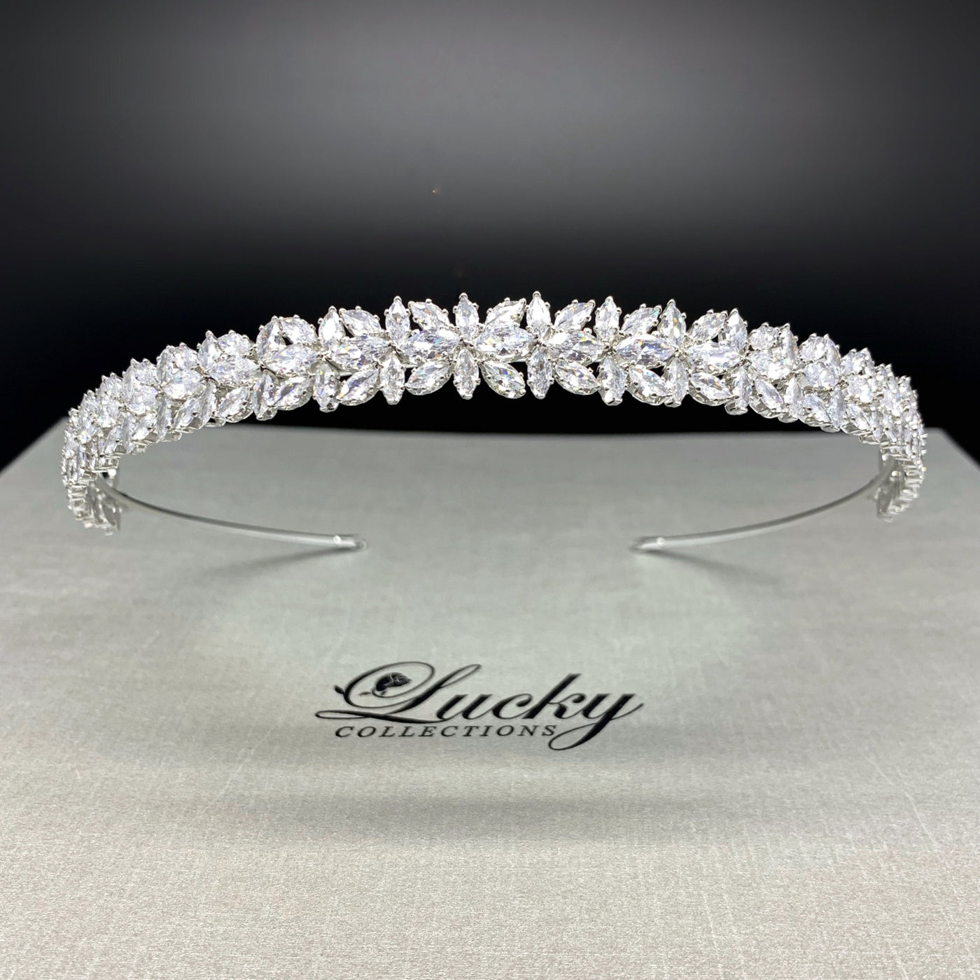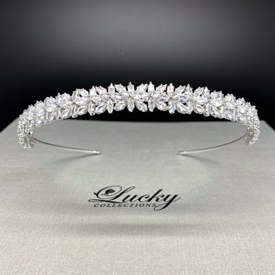 When you are undecided about wearing a tiara or headband, this Lucky Collections™ marquise cut Cubic Zirconia accessory is the best of both worlds. This can be worn with a tilt as a short tiara during the ceremony and then worn flat for ultimate comfort during the reception, designed with pin loops at the end for security as you dance the night away.