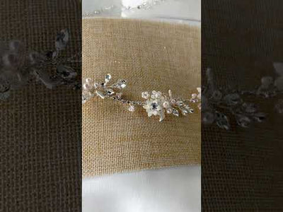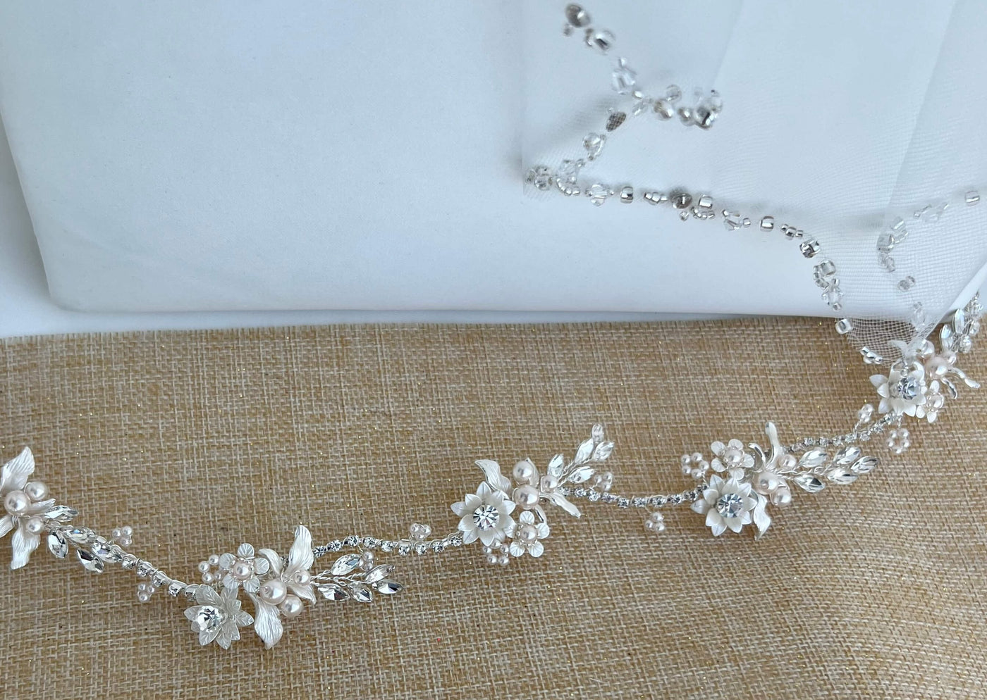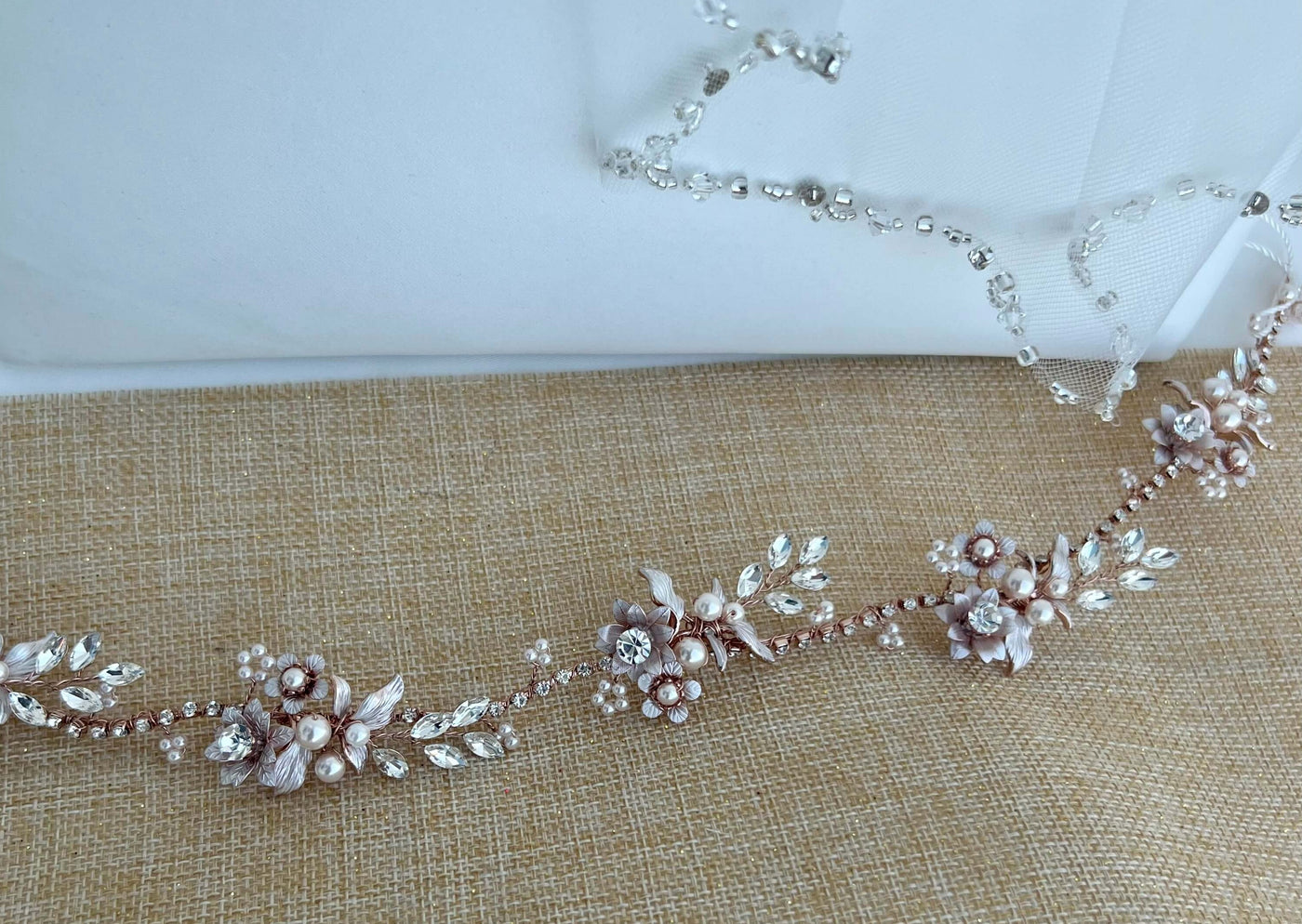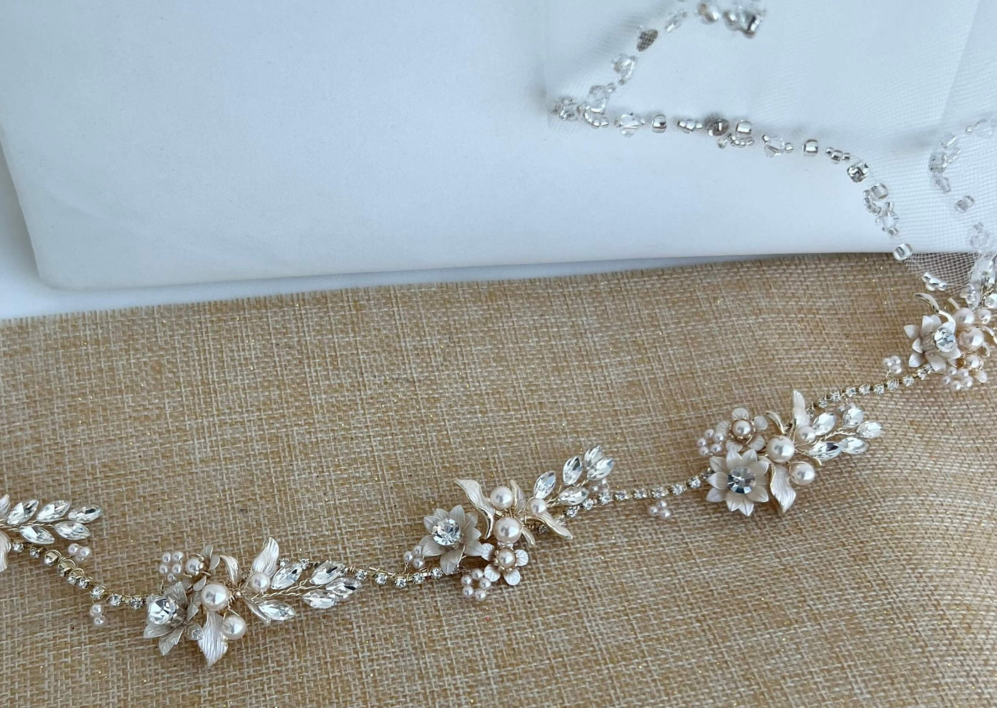 Bridal headband measures 14 inches. The floral motifs measure 2 inches x 1 inch.