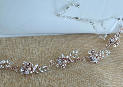 -The rose gold bridal pearl headband is designed with rhinestones and blush color pearls